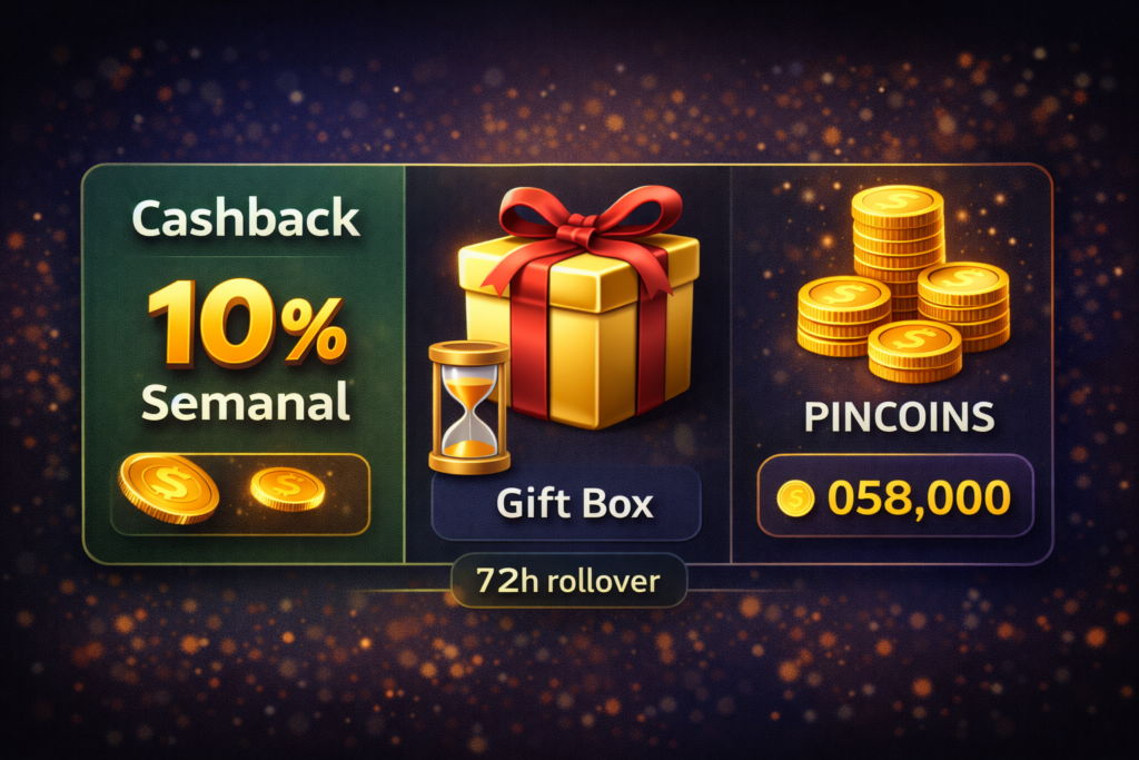 | Gift Box | Dinero real hasta $100,000, fondos de bono, 1,000,000 pincoins, 500,000 free spins | Recibes 1 caja por cada $100 de apuesta en juegos elegibles (máx. $5 por apuesta) | Válido 10 días (240 horas) desde la acreditación, máximo 10 cajas por día y 100 por cuenta |